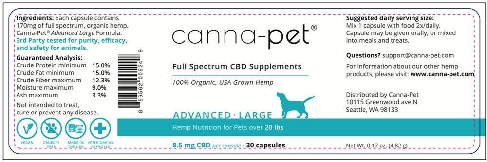 Our products contain Canna-Pet® Advanced CBD, a full spectrum of hemp, terpenes and flavonoids. Utilizing extensive experience with hemp supplements and incorporating the latest research data, Advanced Large delivers even more of what has made our products so popular with pets, owners and veterinarians alike. Canna-Pet® Advanced Large offers significantly higher CBD and terpene content and bioavailability than other capsules, and is appropriate for medium, large and giant-sized pets. Further information.