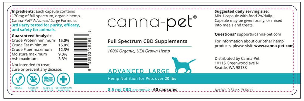 Our products contain Canna-Pet® Advanced CBD, a full spectrum of cannabinoids, terpenes and flavonoids. Utilizing extensive experience with hemp supplements and incorporating the latest research data, Advanced Large delivers even more of what has made our products so popular with pets, owners and veterinarians alike. Canna-Pet® Advanced Large offers significantly higher CBD and terpene bioavailability and content than other capsules, and is appropriate for medium, large and giant-sized pets. Further information.