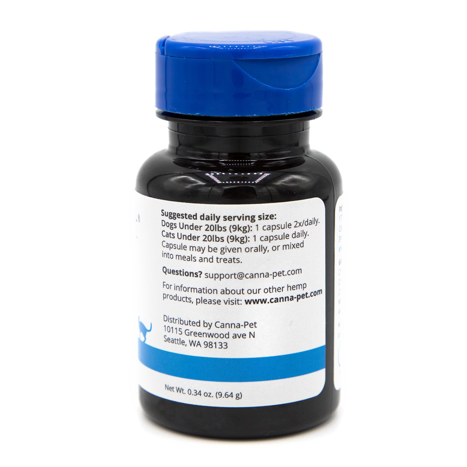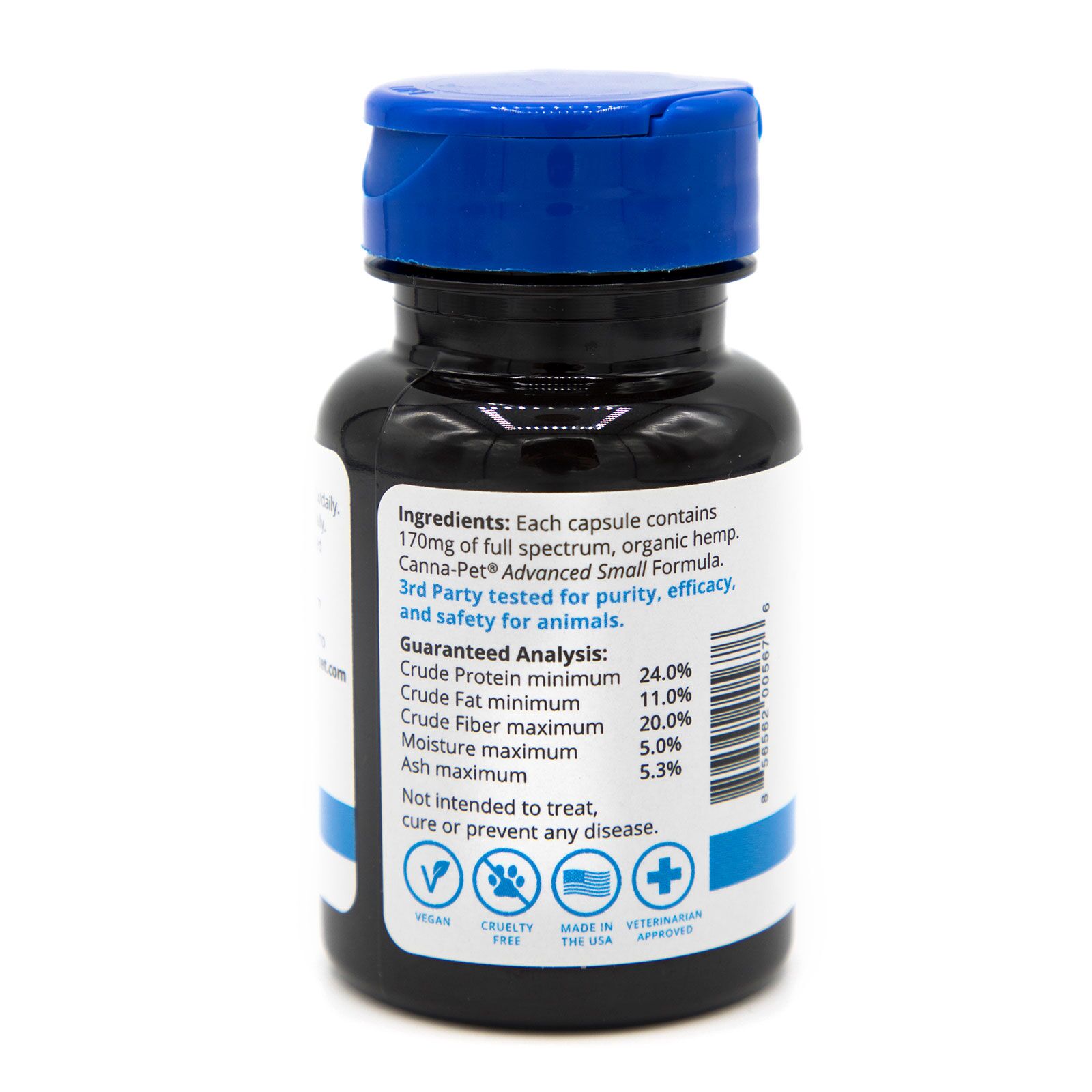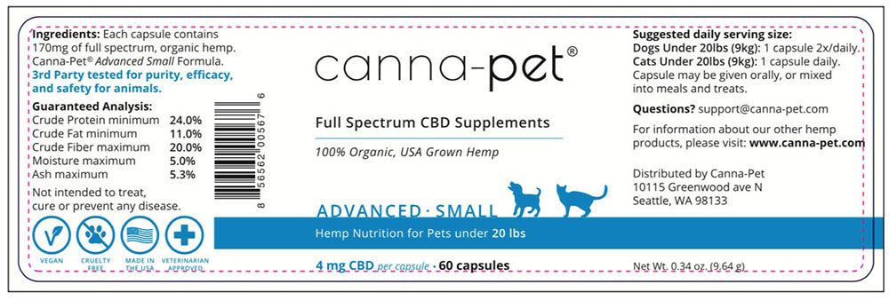 Our products contain Canna-Pet® Advanced CBD, a full spectrum of cannabinoids, terpenes and flavonoids. Utilizing extensive experience with CBD supplements and incorporating the latest research data, Advanced Small delivers even more of what has made our products so popular with pets, owners and veterinarians alike. Canna-Pet® Advanced Small offers significantly higher CBD and terpene bioavailability than other capsules, and is appropriate for pets from toy to medium size. 100% organic hemp. Further information.